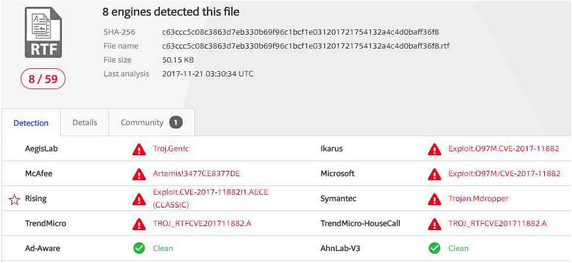 补丁发布几天后,网上就出现了漏洞利用POC,随后瑞星又捕获到一个使用此漏洞的病毒样本。多引擎扫描网站Virustotal上的扫描结果显示,瑞星是国内第一家可以对此病毒样本进行拦截查杀的安全公司。
