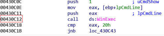 由于EQNEDT32.EXE这个程序年久失修,没有开启随机基址等各种漏洞缓解措施,漏洞触发后,直接跳转到硬编码的0x430C12地址执行WinExec,运行命令访问恶意网址。