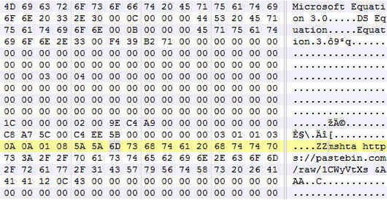 可以看到攻击者构造的漏洞利用代码,使用mshta访问指定的网址,执行网页中的恶意脚本。 由于EQNEDT32.EXE这个程序年久失修,没有开启随机基址等各种漏洞缓解措施,漏洞触发后,直接跳转到硬编码的0x430C12地址执行WinExec,运行命令访问恶意网址。 转自:瑞星企业安全