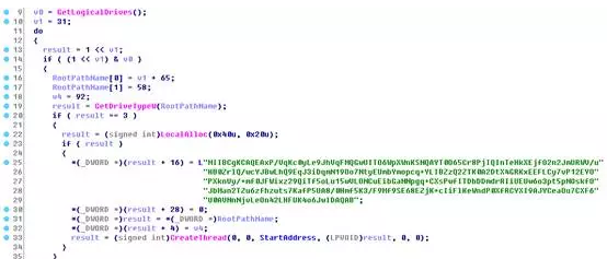 所使用的公钥被硬编码在程序中。 ▲ 加密所使用的公钥 除C:\Windows目录下外,所有盘符下的所有文件夹均会被加密。被加密的文件格式如下所示。 >>>> 3.2.4 传 该样本会释放出名为dllhost.dat的文件。该文件是微软Sysinternals工具集中的PsExec程序。该程序可用于在远程机器上执行命令。控制端和被控制端的数据传输都是通过445(Windows2000)/135或139端口进行(非Windows 2000)。