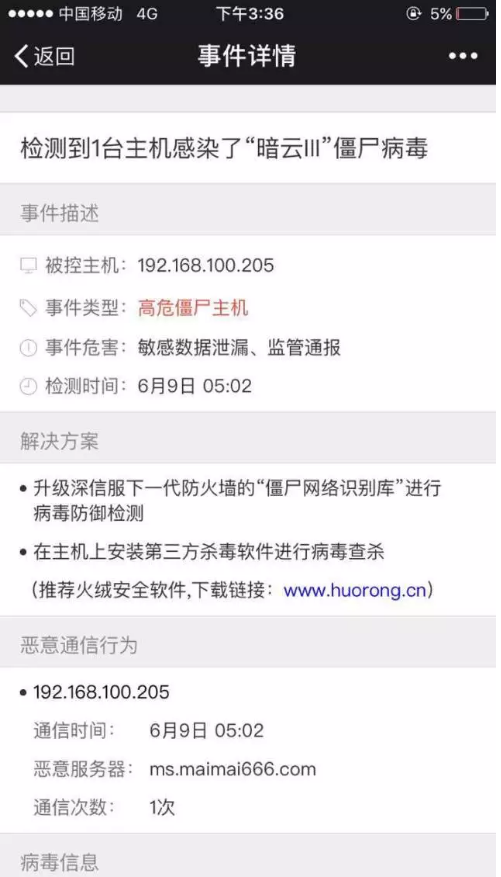 针对“暗云Ⅲ”,深信服防火墙已具备病毒检测功能,升级僵尸网络规则库到20170612及其以上版本即可进行病毒检测。已经绑定深信服安全服务的用户,还可通过“深信服安全云”公众号及时获取告警信息。