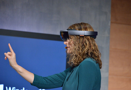 微软全新推出的HoloLens头盔看起来很像目前大热的各种虚拟现实头戴设备,但是微软为其增加了被称为“Windows Holographic”的全息体验,能在佩戴者眼前显示全息图像。该设备自带CPU、显卡和专门的全息图像处理器,前方的暗色面罩带有一块透明的显示屏,能通过有空间感的音效让佩戴者“听到”身后的全息物体,还整合了一系列动作和环境传感器。