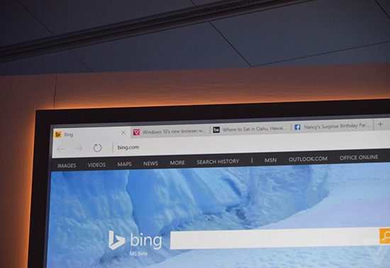 微软正式发布了全新网络浏览器Project Spartan——该浏览器采用全新渲染引擎,而微软重点强调了它的三大新功能:第一,新的墨迹支持,能让用户在网页上手写笔记并同步至OneDrive以及与协作人员共享;第二,新的阅读模式,能够去除页面上的杂乱项目从而让用户像读书一样阅读页面内容,还有能在所有设备进行同步的阅读列表;第三,整合语音助理Cortana,随时告知用户与其相关的信息,例如用户在餐馆页面上Cortana就会告诉用户前往这家餐馆的路线,还会显示餐馆的营业时间和联系信息,等等。